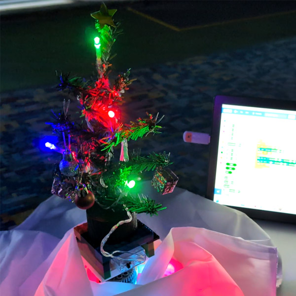 - Create a Scratch program to spin the tree and control LED lights.