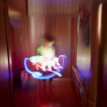 Coby draw shark body with blue light , painted eyes with red light and made shark back fin by yellow light.